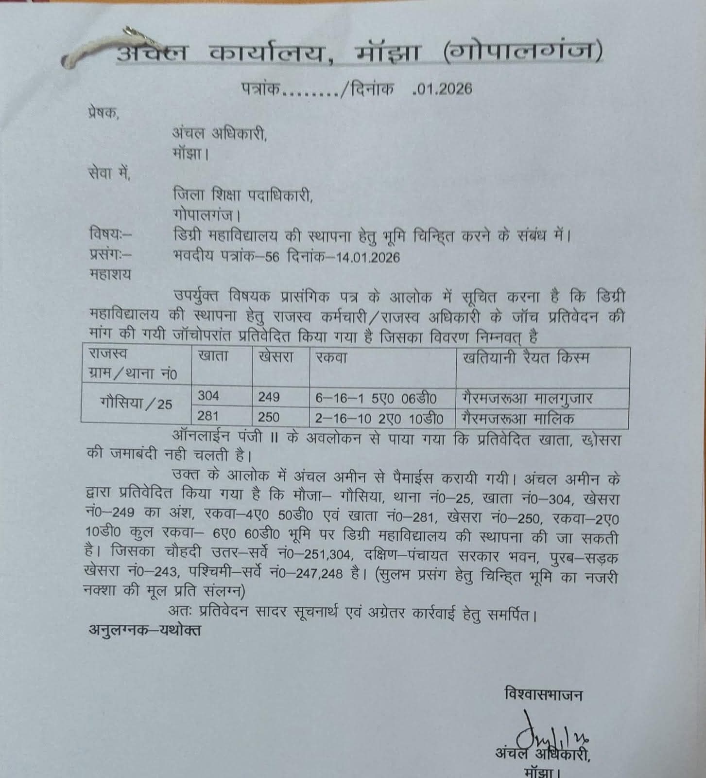 गोपालगंज: मांझा के गौसिया में खुलेगा नया डिग्री कॉलेज, 6.50 एकड़ जमीन चिन्हित।