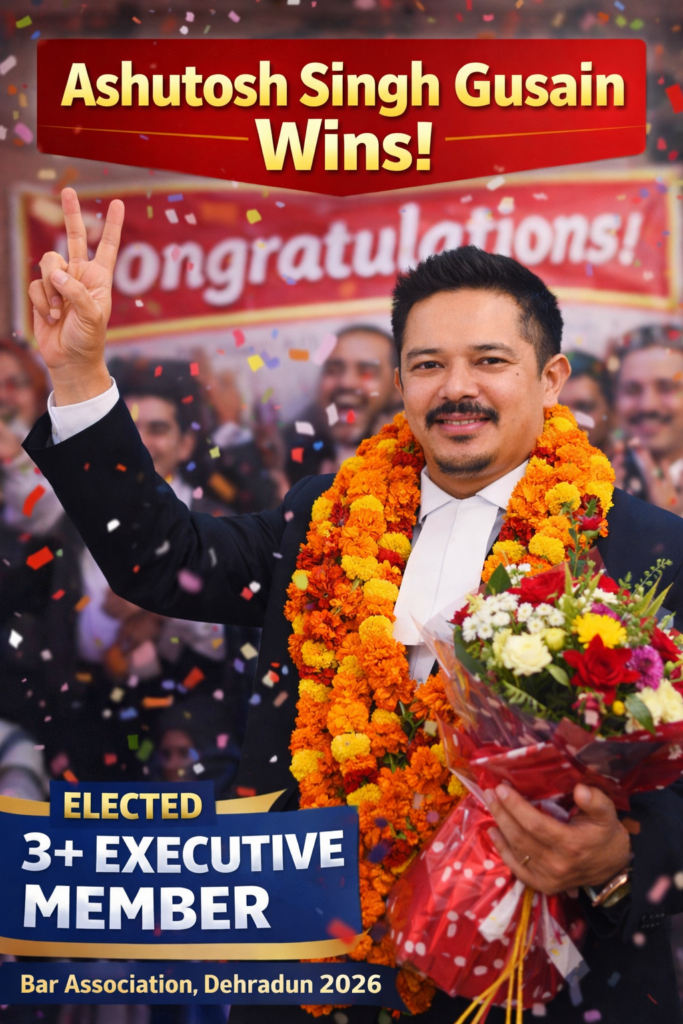 देहरादून बार एसोसिएशन चुनाव 2026 में अधिवक्ता आशुतोष सिंह गुसाईं ने 3+ एग्जीक्यूटिव मेंबर पद पर उल्लेखनीय जीत दर्ज की। उनकी जीत के साथ ही अधिवक्ताओं और समर्थकों में उत्साह की लहर दौड़ गई। 23 फरवरी 2026 को आयोजित शपथ ग्रहण समारोह में उन्होंने विधिवत अपने पद और दायित्व की शपथ ली।