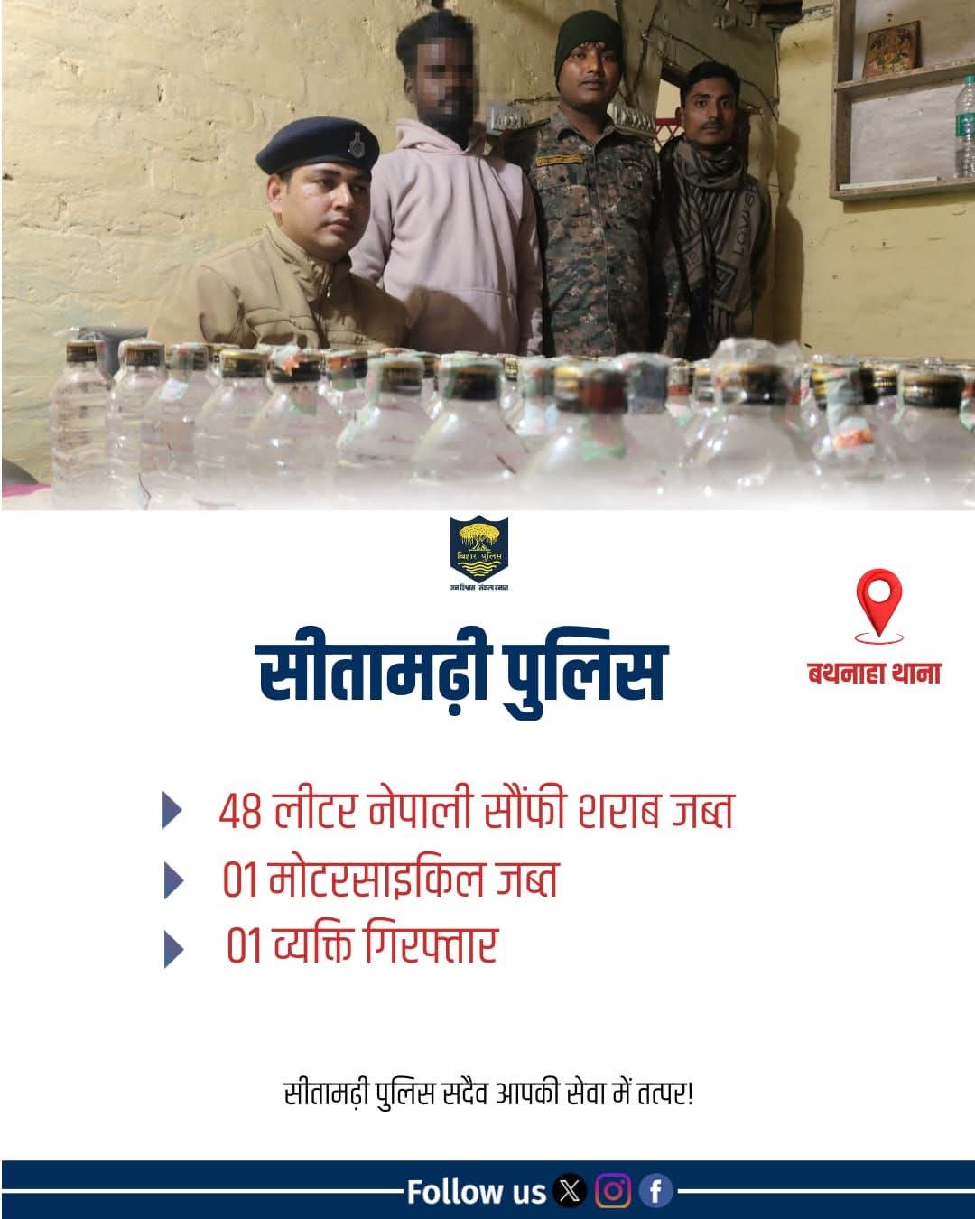 बथनाहा (सीतामढ़ी)।। सीमावर्ती क्षेत्रों में शराब तस्करों के खिलाफ चलाए जा रहे विशेष अभियान के तहत बथनाहा थाना अंतर्गत महुआवा पिकेट पुलिस को बड़ी कामयाबी मिली है। पुलिस टीम ने कार्रवाई करते हुए एक मोटरसाइकिल पर लदी 48 लीटर नेपाली सौंफी शराब बरामद की है। इस मामले में पुलिस ने मौके से एक व्यक्ति को गिरफ्तार भी किया है। मिली जानकारी के अनुसार, पुलिस को गुप्त सूचना मिली थी कि नेपाल सीमा से शराब की एक खेप भारतीय क्षेत्र में प्रवेश करने वाली है। सूचना के आलोक में महुआवा पिकेट पुलिस ने त्वरित कार्रवाई करते हुए संदिग्ध रास्तों पर निगरानी बढ़ा दी। इसी दौरान एक मोटरसाइकिल सवार को रोककर तलाशी ली गई, जिसमें भारी मात्रा में नेपाली शराब बरामद हुई।