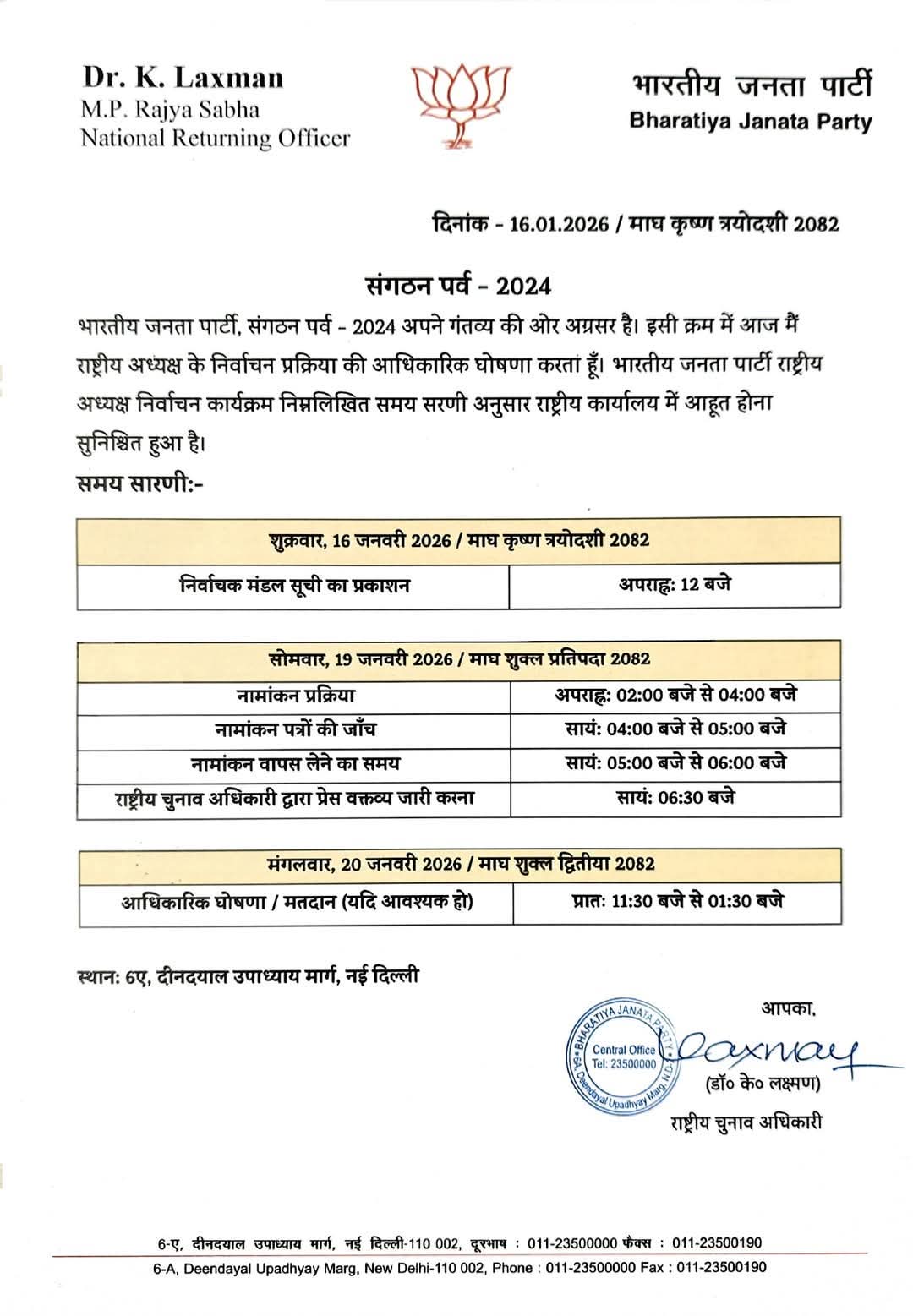 नई दिल्ली। भारतीय जनता पार्टी ने संगठन पर्व–2024 के तहत राष्ट्रीय अध्यक्ष के चुनाव की आधिकारिक प्रक्रिया शुरू कर दी है। पार्टी के राष्ट्रीय चुनाव अधिकारी एवं राज्यसभा सांसद डॉ. के. लक्ष्मण ने शुक्रवार को चुनाव कार्यक्रम की अधिसूचना जारी की। इसके साथ ही भाजपा संगठन में नए राष्ट्रीय नेतृत्व के चयन की प्रक्रिया तेज हो गई है।