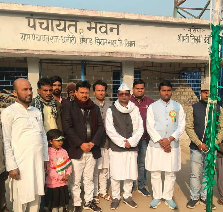 सिवान। जिले के सदर प्रखंड अंतर्गत धनौती पंचायत के पंचायत भवन परिसर में 77वें गणतंत्र दिवस के अवसर पर भव्य रूप से राष्ट्रीय ध्वजारोहण कार्यक्रम का आयोजन किया गया। इस अवसर पर पंचायत के सरपंच द्वारा राष्ट्रीय ध्वज फहराया गया। कार्यक्रम में पंचायत की मुखिया तिलकी देवी, मुखिया प्रतिनिधि बिनय चौहान, सदर प्रखंड के उप प्रमुख कन्हैया यादव सहित अन्य जनप्रतिनिधि एवं पंचायत के गणमान्य लोग उपस्थित रहे। सभी ने एक साथ राष्ट्रीय ध्वज को सलामी दी और देश की एकता, अखंडता एवं संविधान के प्रति निष्ठा की शपथ ली।